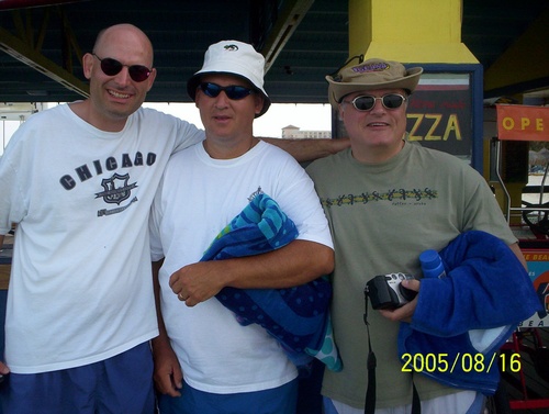 Eric P40GY (K9GY), Jerry P40QX (KE9I), and Mike P40C (AJ9C) awaiting the boat pickup for a morning snorkel sail on the "Mi Dushi" wood sailboat. The group travelled to Aruba for the WAE CW contest in August 2005.