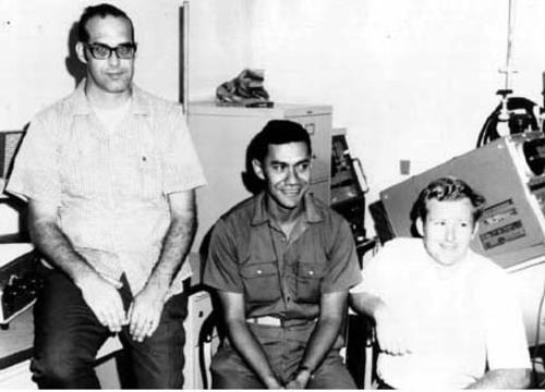 This picture was taken when the USNS Watertown stopped at Pitcairn between operations. With Tom is Dave K7JJ (then W6HUQ) and John Steffan. We are shown in the ship's transmitter room.