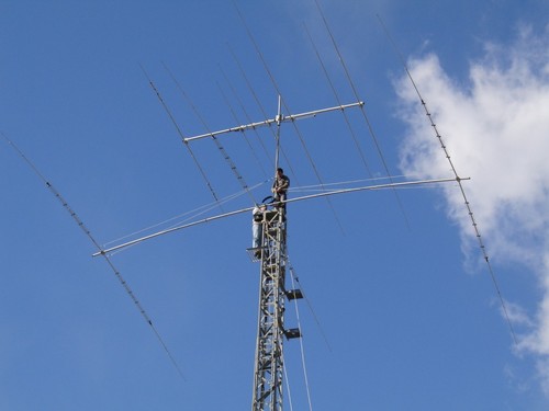 Dani EA5FV (on top) and Juan EA5RS (on platform) install new Yagi at EA5RS