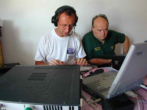 The D44TC Contest Station is owned by five members of the Marconi Contest Club, here are two of them: Alberto, IV3TAN, running the pile-up while Fabio I4UFH looks at the rate on the monitor...